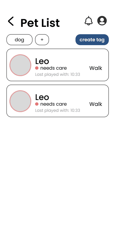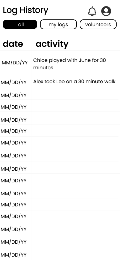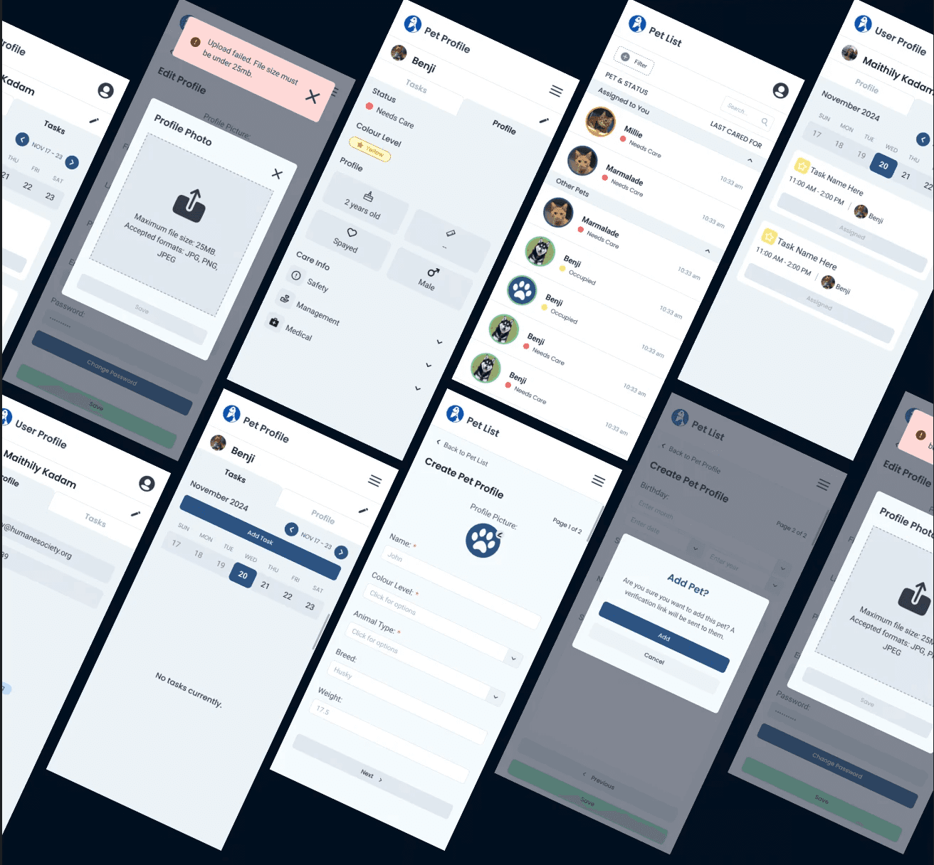 These wireframes focused on core shelter workflows; tracking animals, managing volunteers, and accessing records quickly—prioritizing clarity and ease of use for all experience levels.
